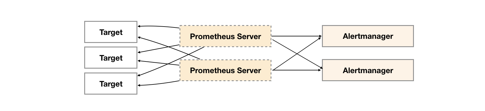 为了提升Promthues的服务可用性,通常用户会部署两个或者两个以上的Promthus Server,它们具有完全相同的配置包括Job配置,以及告警配置等。当某一个Prometheus Server发生故障后可以确保Promthues持续可用。